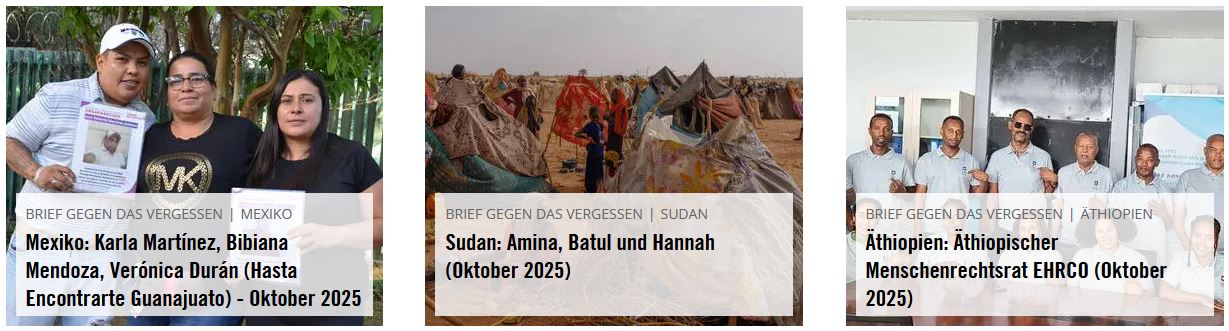 Weiter unten werden monatlich drei Fälle angezeigt. Durch einen Klick auf’s Bild gelangen Sie zu näheren Infos zu den Fällen und haben die Möglichkeit eigene oder vorformulierte Briefe / E-Mails an die verantwortliche Person zu schicken..