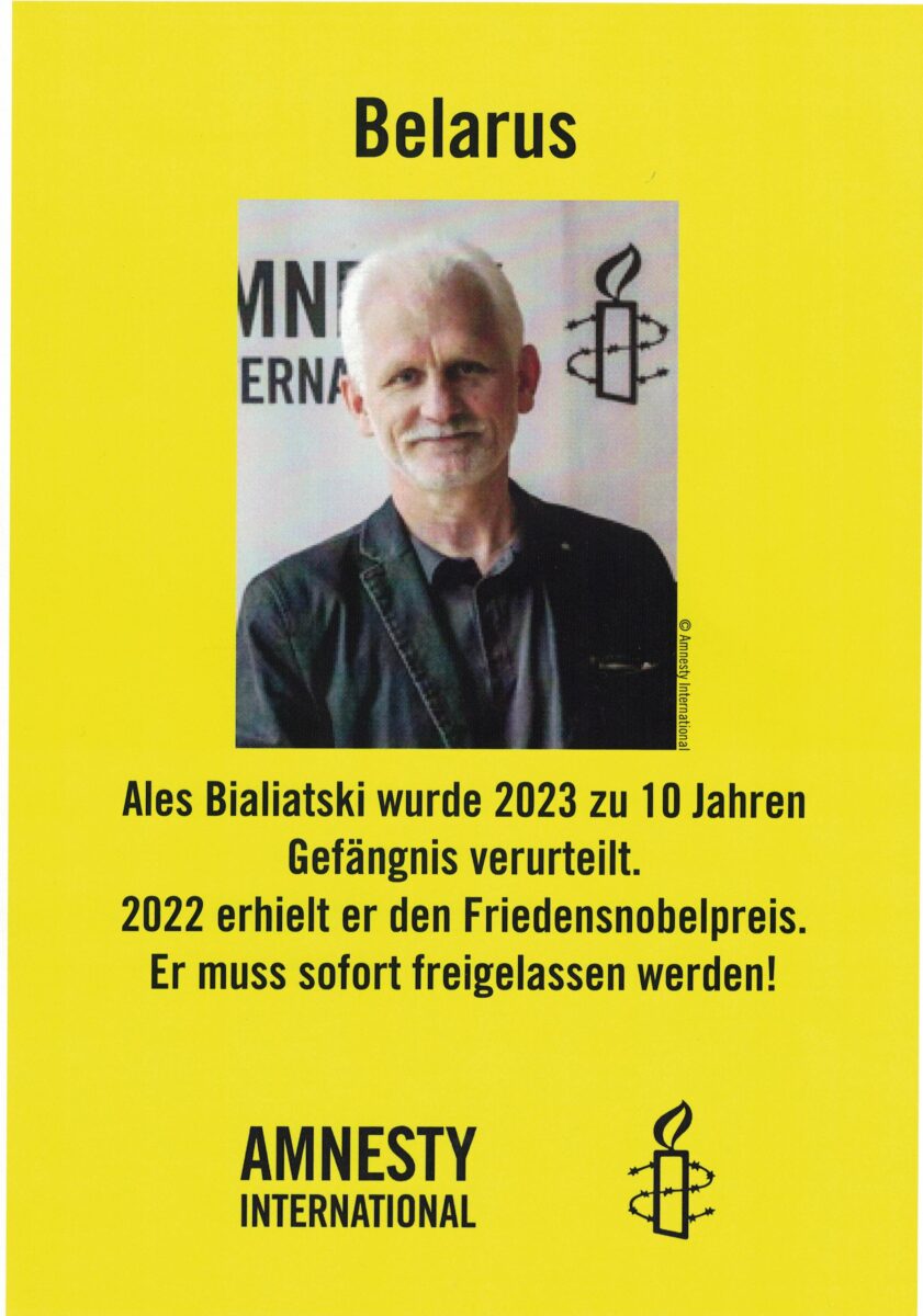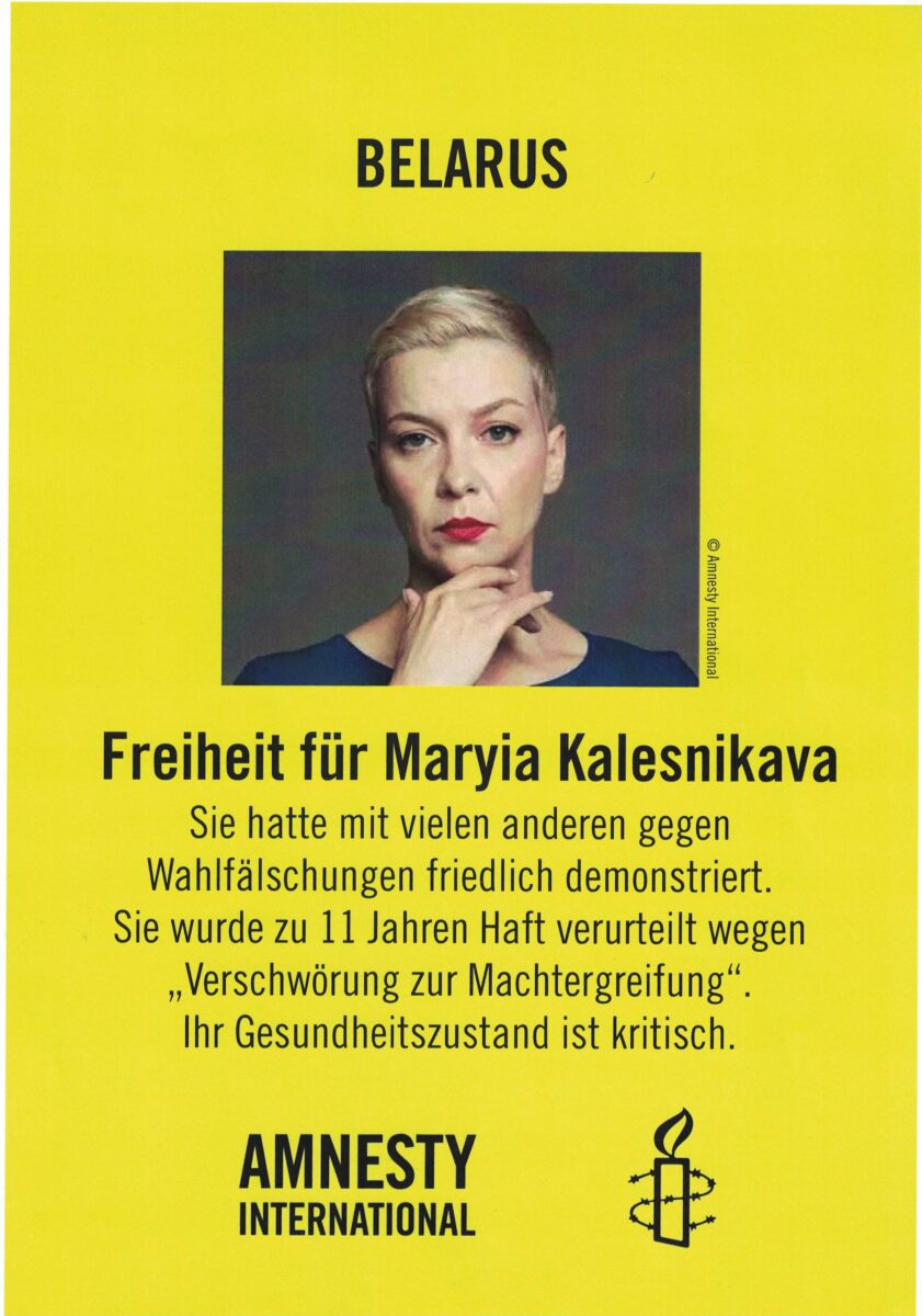 Beim Infostand am Samstag, 15.11. informieren wir zu Belarus . Am Infostand können Sie Postkarten für die Menschenrechtsaktivisten Ales Bialiatski, Marfa Rabkova und Maryia Kalesnikava schreiben. Alle drei sind politische Gefangene in Belarus.